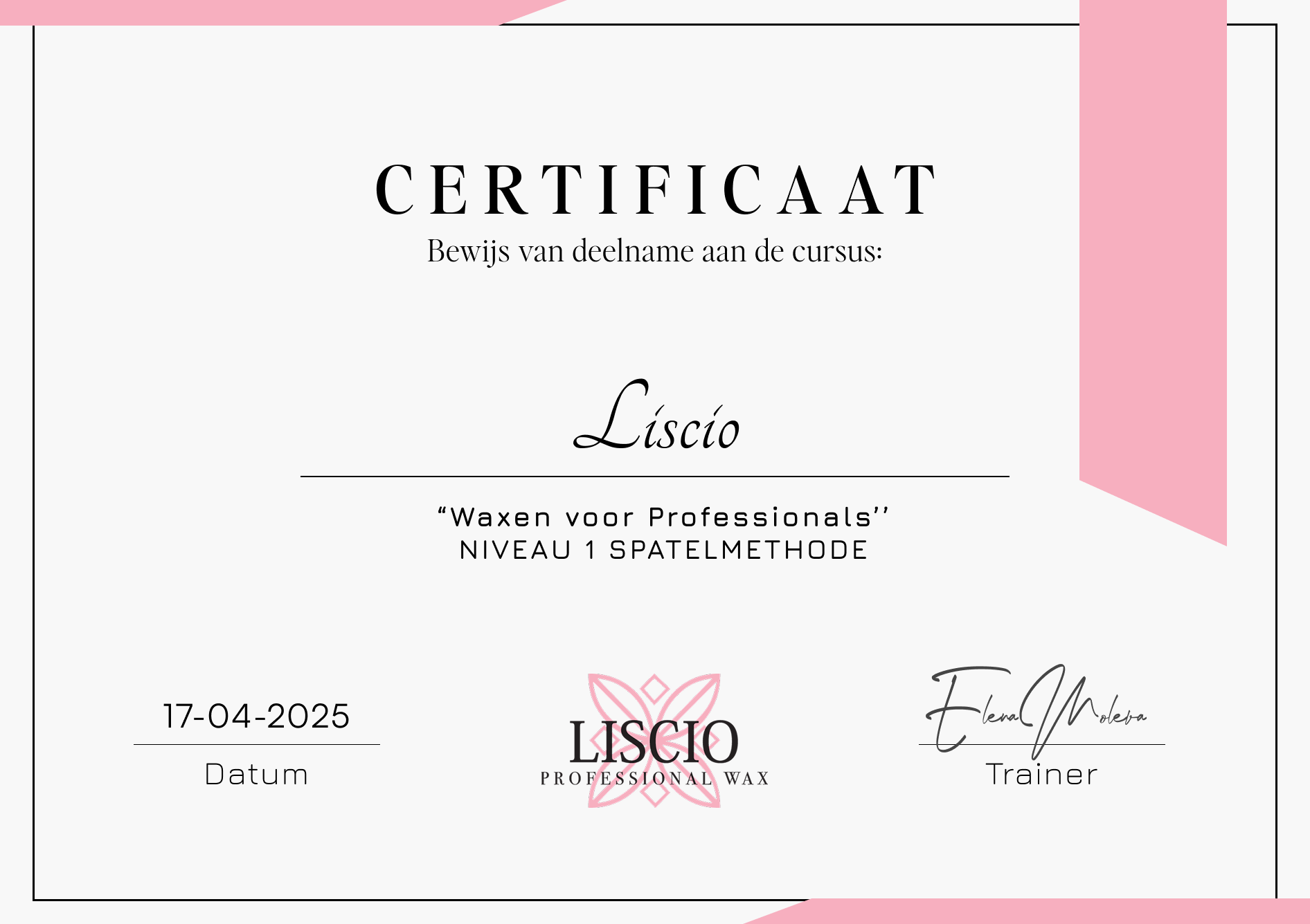Ik merkte dat er veel vraag was naar een praktijkgerichte opleiding, speciaal gericht op waxen. Daarom ben ik in 2013 gestart met mijn eigen waxopleidingscentrum: Liscio Professional Wax – Liscio betekent ‘glad’ in het Italiaans. Sindsdien heb ik al vele cursisten opgeleid, we geven waxcursus voor beginners tot ervaren schoonheidsspecialisten die zich verder willen verdiepen in het vak.